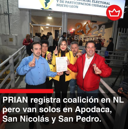 El PRIANRD registró su coalición electoral en Nuevo León pero van solos en las alcaldías de Apodaca, San Nicolás de los Garza y San Pedro Garza García, un bastión del PRI y dos del PAN respectivamente.